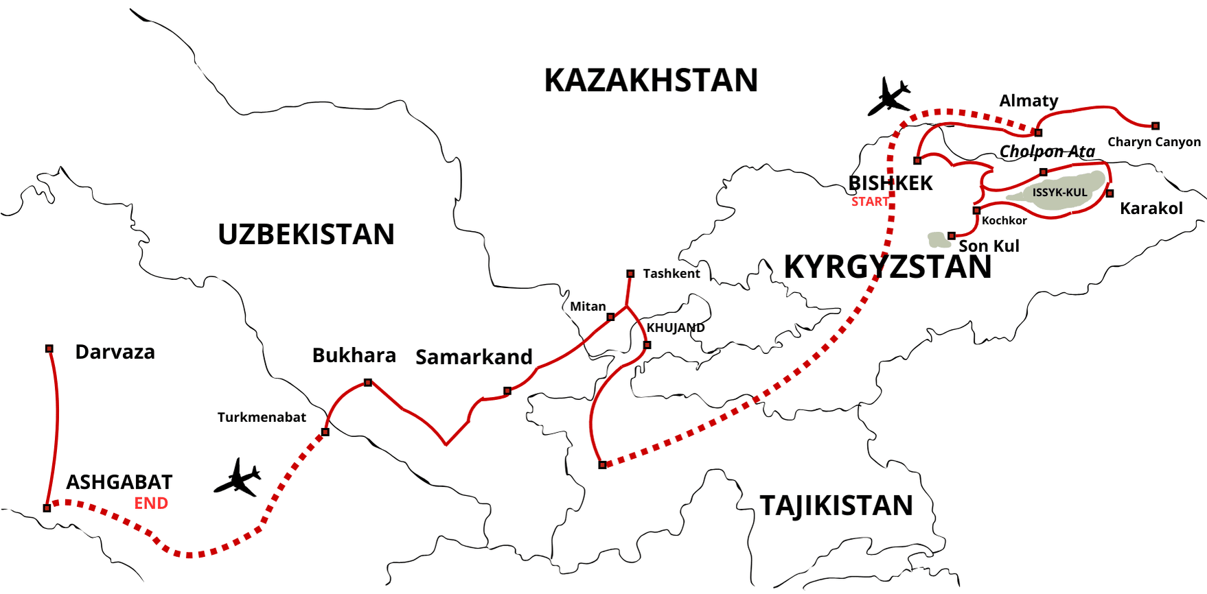 Picnic-style breakfast in Darvaza. After breakfast, drive back to Ashgabat (4 hr). On the way back to Ashgabat, drive to visit “Altyn Asyr” Oriental Bazar (opens on Wed, Thu, Sat, Sun) – Jygyldyk, located 20km to the north of Ashgabat. It is one of the world’s largest open bazaars, filled with colorful rugs, jewelry, carpets, silk, and national Turkmen costumes and animals in other parts.